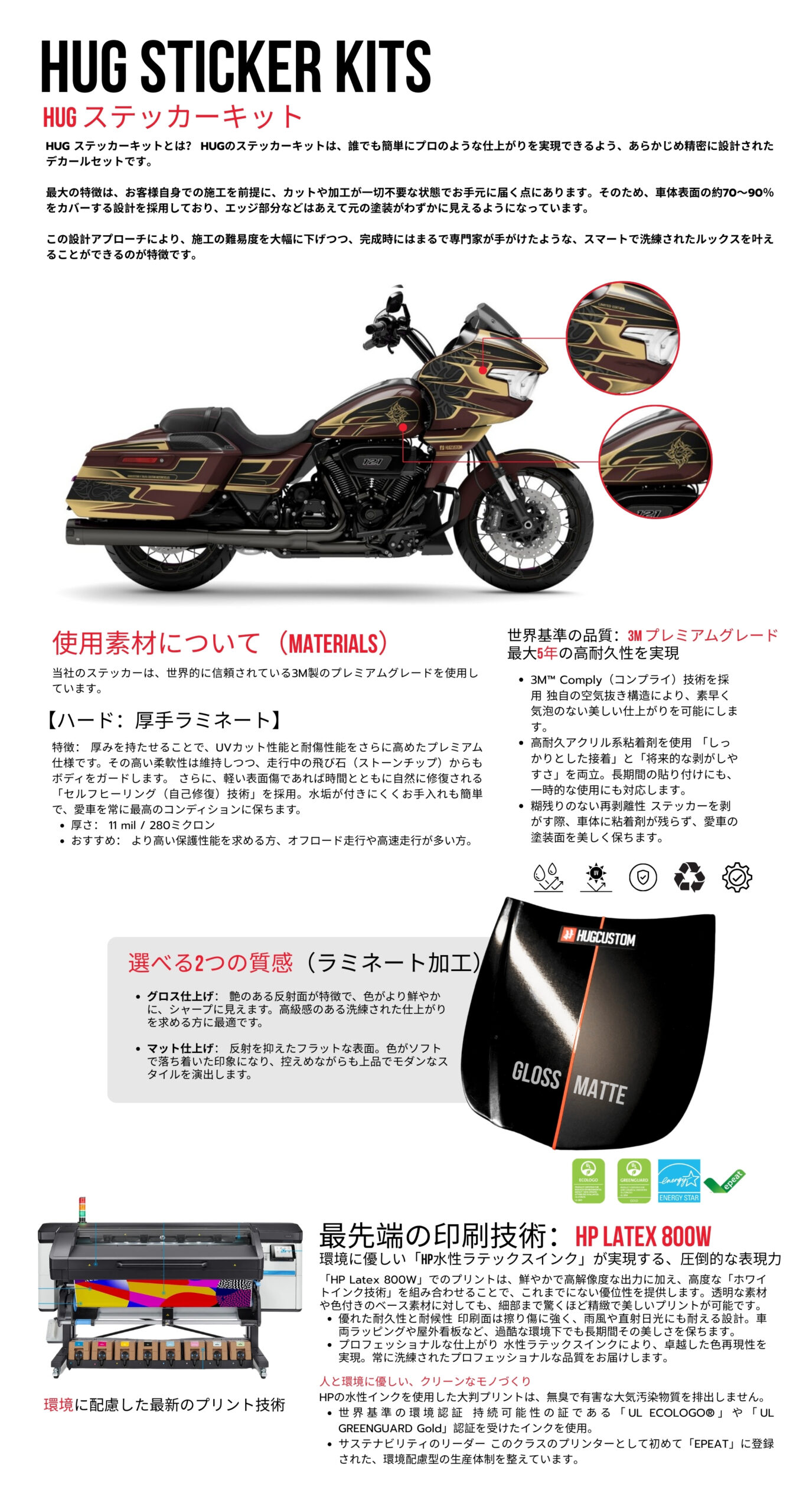 【HUG ステッカーキットとは?】 HUGのステッカーキットは、カットや加工の必要がなく、誰でもプロのような仕上がりを実現できるようあらかじめ設計されたデカールセットです。 そのため、施工のしやすさを考慮して車体表面の約70〜90%をカバーする設計になっており、エッジ部分などにあえて元の塗装色が少し見えるようになっています。この設計により、専門知識がなくてもスムーズに貼り付けられ、熟練の職人が施工したような美しい外観を手に入れることが特徴です。